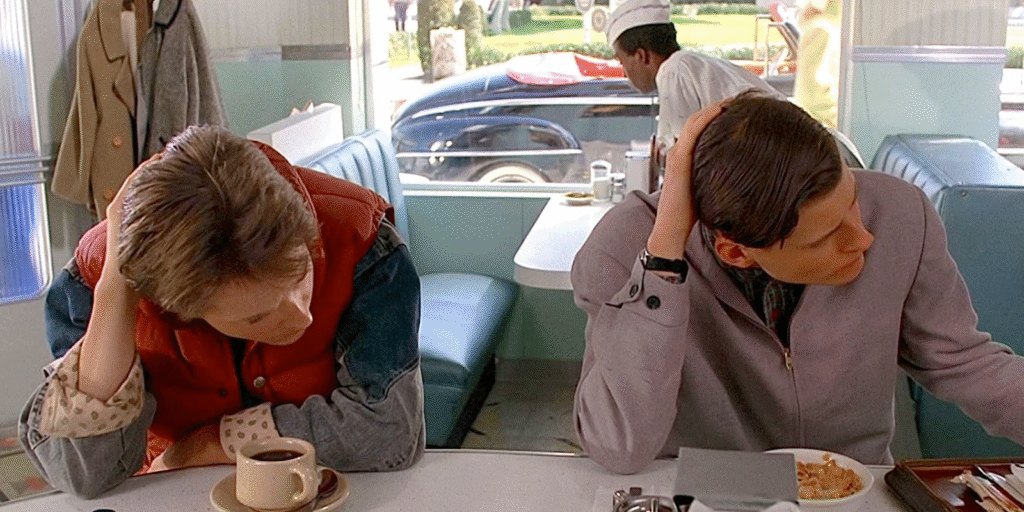 It sort of seems obvious in retrospect, but it’s really quite brilliant how Gale and Zemeckis teed up the external conflict: when Marty is sent back to the 1950s, the first thing that happens is that he disrupts his parents’ meet-cute.*